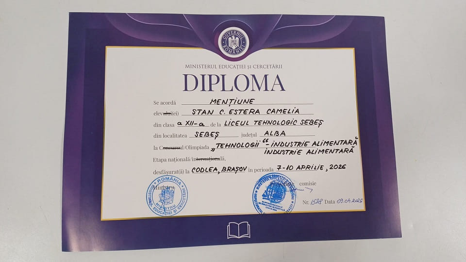 STAN ESTERA CAMELIA, elevă a Liceului Tehnologic Sebeș, în clasa a XII-a C, a obținut Mențiune la etapa națională a Olimpiadei Tehnologii, calificarea Tehnician în Industria Alimentară, disciplina Industrie Alimentară, care s-a desfășurat la Codlea, jud. Brașov, în perioada 7-10 aprilie 2026.