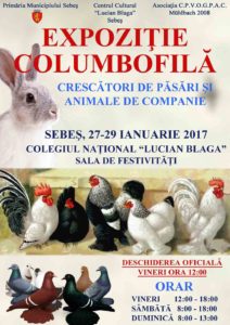Primăria Municipiului Sebeş, în parteneriat cu Centrul Cultural „Lucian Blaga” şi cu Asociaţia crescătorilor de porumbei voiajori, de ornament, păsări şi animale de companie „Mühlbach 2008” organizează, în perioada 27 – 29 ianuarie 2017, o nouă ediţie a „Expoziţiei Columbofile”.