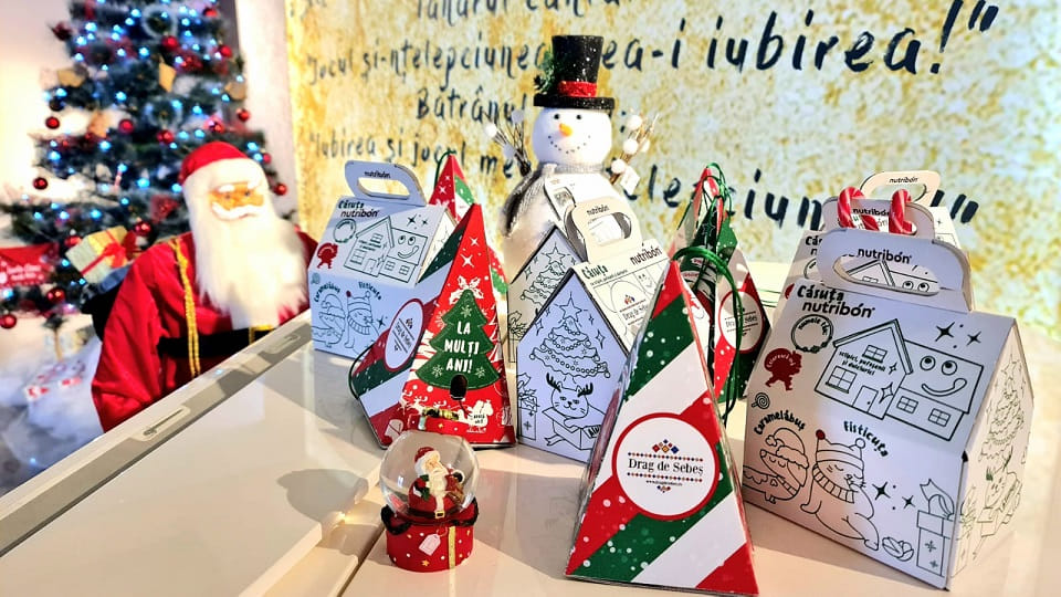 Preșcolarii și elevii claselor primare au primit deserturile ambalate într-o căsuță de carton care poate fi colorată și care cuprinde detalii surpriză, iar elevii din clasele mai mari au primit cadoul sub forma unei piramide purtând inscripția „Drag de Sebeș”.