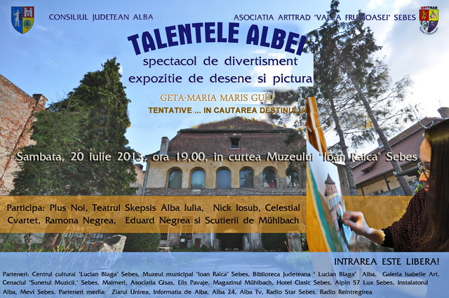 Consiliul Jude좛ean Alba, 쎮n parteneriat cu Asocia좛ia Art-Trad Valea Frumoasei Sebe좙 organizeaz쒃 s쎮mb쒃t쒃, 20 iulie 2013, de la ora 19.00, 쎮n gr쒃dina Muzeului Municipal Ioan Raica...