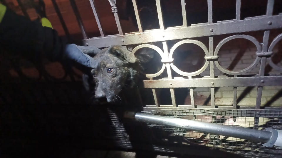 La sosirea forțelor de intervenție, câinele era blocat intr-un gard de fier.