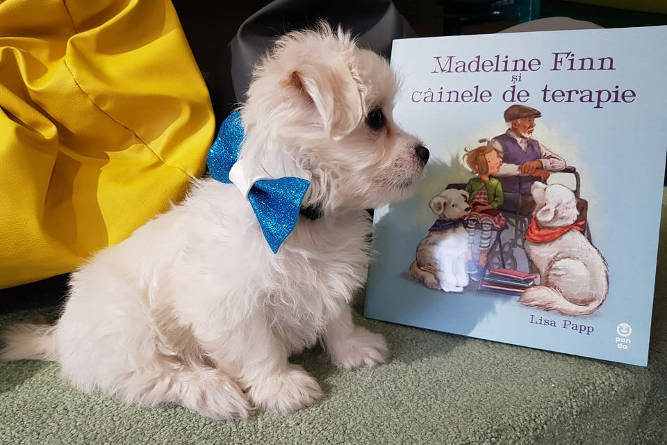„Acesta este BLUE. BLUE EYES. Câinele nostru de terapie de la bibliotecă.