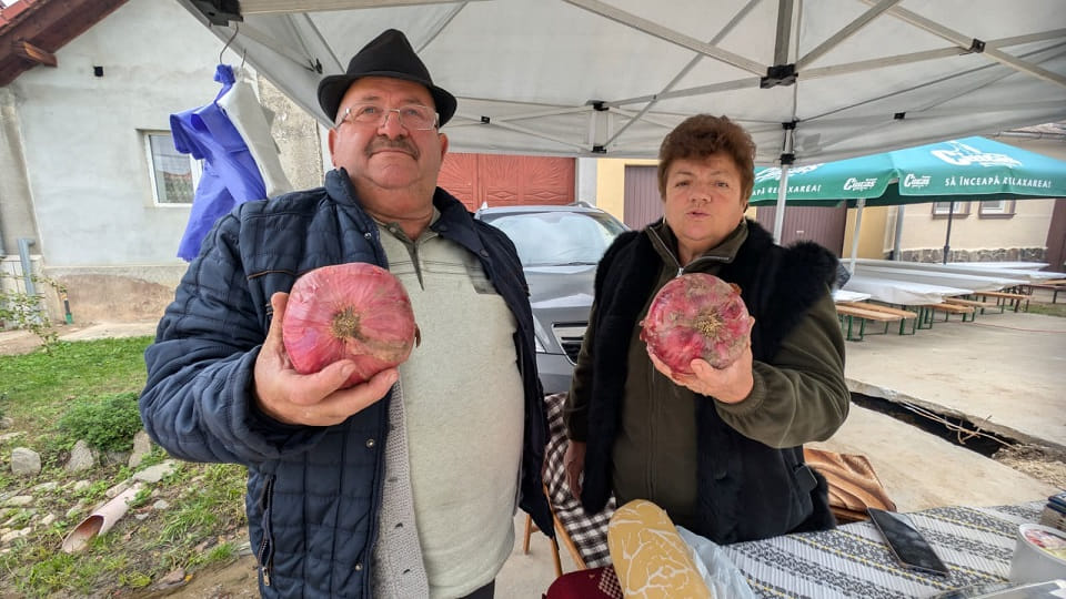 „Această ceapă este plantată și crescută la 15 kilometri de creasta muntelui, spre Șureanu, cu gunoi de grajd și pământul… ce a dat de la natură, ploaie, nimic altceva”, a spus Maria Cândea, mândră de recolta lor.