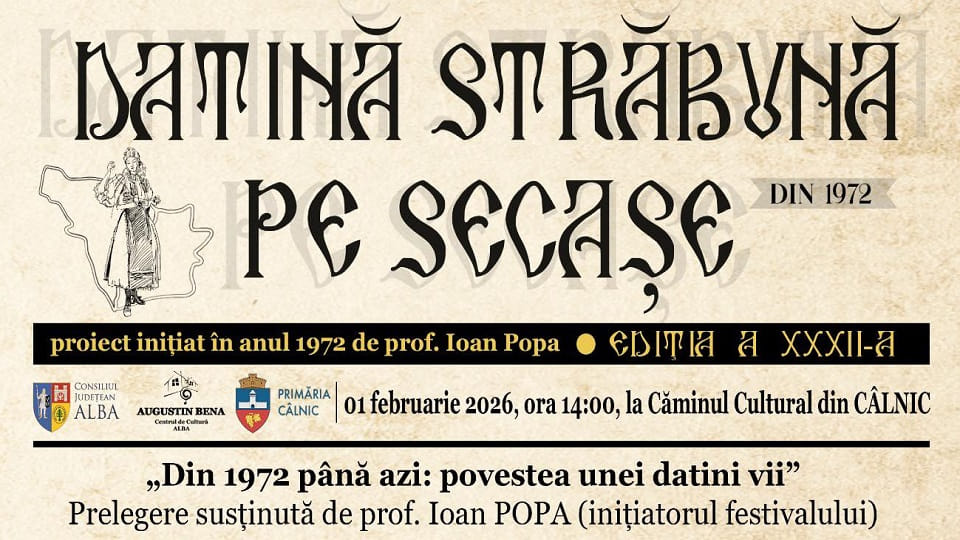 Cea de-a XXXII-a ediție a evenimentului „Datină străbună pe Secașe” va avea loc duminică, 1 februarie 2026, de la ora 14.00, la Căminul Cultural din Câlnic.