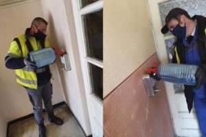 În această dimineață, angajați de la SPAP Sebeș au montat recipiente cu dezinfectanți la toate blocurile de locuințe din Petrești