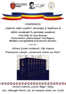 Centrul Cultural „Lucian Blaga” Sebeș va găzdui joi, 23 ianuarie 2020, în sala „Gheorghe Maniu”, începând cu ora 16:00, conferința „Datoria vieții noastre” – Generație și implicare la elitele românești în perioada modernă, susținută de academicianul Ioan Bolovan.