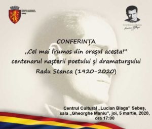 Centrul Cultural „Lucian Blaga” din Sebeș va găzdui joi, 5 martie 2020, în sala „Gheorghe Maniu”, începând cu ora 17:00, conferința „Cel mai frumos din orașul acesta!”- centenarul nașterii poetului și dramaturgului Radu Stanca (1920-2020).