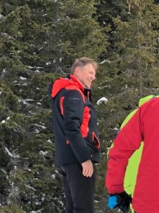 ”Companie selectă la schi… Hello, Mr. Iohannis! LE: S-a așezat, evident, la coadă. (Și schiază foarte, foarte bine!)”, a scris turistul pe Facebook.