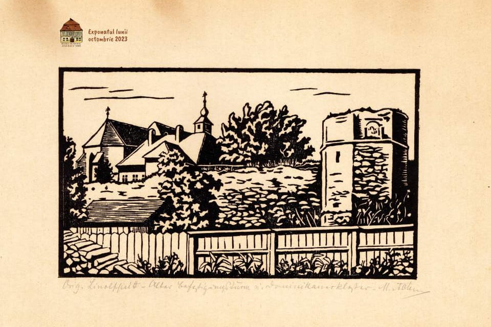 Linogravura „Vechiul turn al fortificației și Mănăstirea Dominicană din Sebeş”, exponatul lunii octombrie la Muzeul Municipal „Ioan Raica”