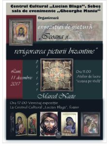 De la ora 17.00 – foaierul Centrului Cultural „Lucian Blaga” – Vernisajul expoziției „Icoana și revigorarea picturii bizantine”, aparținând artistului plastic Marcel Naste.