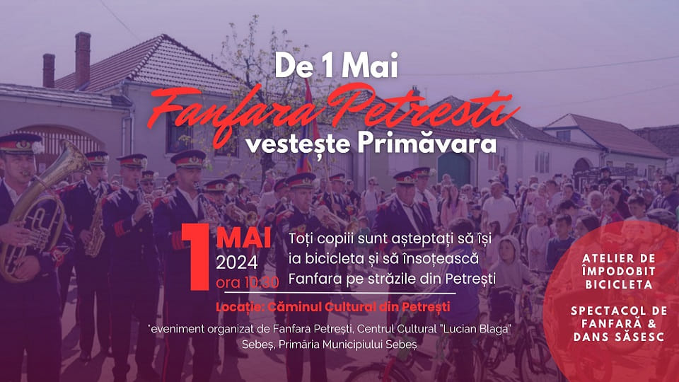 De 1 Mai, continuăm tradiția de 145 de ani a Fanfarei Petrești. Miercuri, 1 mai, la ora 10:30, toți copiii sunt rugați să își ia bicicletele și alături de părinți, frați sau bunici, să vină în fața Căminului Cultural din Petrești pentru a ne ajuta în misiunea noastră de vestire a primăverii. Am pregătit un eveniment special dedicat copiilor și părinților, unde vom avea un atelier de împodobire a bicicletelor, un mic concert de fanfară și un spectacol minunat de dansuri săsești susținut de Trupa de dansuri săsești Sebeș/Sächsische Volkstanzgruppe Mühlbach, după care copiii cu biciclete împodobite, ne vor însoți pe străzile din Petrești, în marșul nostru care vestește primăvara.