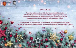 Luni, 23 decembrie 2019, începând cu ora 16:00, sala de spectacole „Radu Stanca” a Centrului Cultural „Lucian Blaga” Sebeș va găzdui spectacolul de teatru „O altfel de poveste de Crăciun”, în limba engleză, pus în scenă în cadrul seminariilor de limba engleză prin lectură și joc de rol, coordonate de doamna profesor Lavinia Kamla Donose.