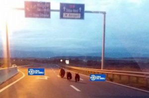 Conducătorii auto care s-au aflat duminică dimineața pe A1, între Săliște și Sibiu, au avut parte de o întânire mai puțin obișnuită: trei urși alergau în voie pe autostradă, în apropiere de ieșirea spre Ocna Sibiului.