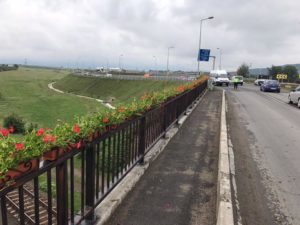 Pasarela de la ieșirea din Sebeș înspre Lancrăm, împodobită cu jardiniere cu mușcate roșii