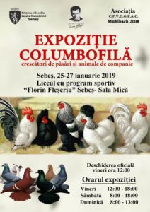 Primăria Municipiului Sebeş, în parteneriat cu Centrul Cultural „Lucian Blaga” şi cu Asociaţia crescătorilor de porumbei voiajori, de ornament, păsări şi animale de companie „Mühlbach 2008″ organizează, în perioada 25 – 27 ianuarie 2019, o nouă ediţie a „Expoziţiei Columbofile”.