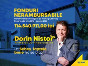 Publicitate electorală | Primarul liberal Dorin Nistor a demonstrat că la Sebeș s-a putut într-un singur mandat ceea ce nu s-a făcut în 4 mandate: fonduri nerambursabile câștigate pentru Sebeș în valoare de 114 milioane lei!