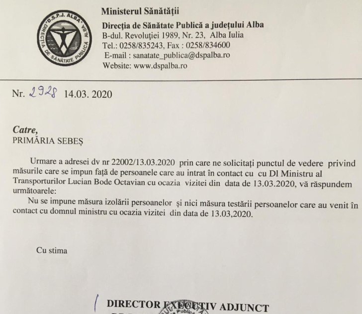 Rezultat NEGATIV la testul de infecție cu corinavirus, pentru ministrul care a vizitat ieri SEBEȘUL