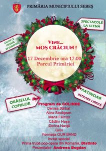 Primăria Municipiului Sebeș are plăcerea de a vă invita, sâmbătă, 17 decembrie 2016, începând cu ora 17.00, în Parcul Primăriei, la întâlnirea cu Moș Crăciun, care va fi întâmpinat cu un concert extraordinar de colinde în aer liber.