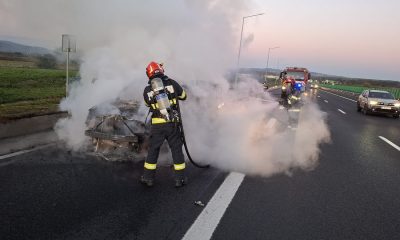 Autoturism cuprins de flăcări pe Autostrada A1, în zona Pianu. Au intervenit pompierii militari din Sebeș