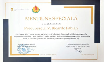 Felicit쒃ri elevului nostru, Precupescu Ricardo Fabian, clasa a XII-a A, pentru premiul III, ob좛inut la Olimpiada de Limbi Romanice Limba spaniol쒃 etapa jude좛ean쒃, din 23 martie...