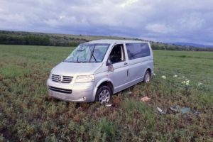 Tânăr din Miercurea Sibiului cercetat de polițiști, după ce a furat un microbuz, l-a condus fără permis și s-a răsturnat pe un teren agricol din apropiere de Gârbova