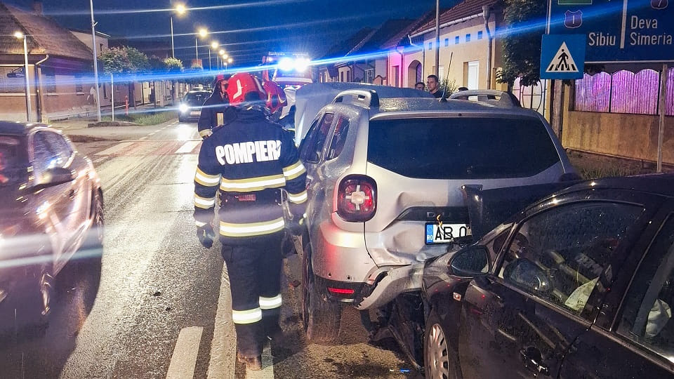Polițiștii s-au deplasat la fața locului și au constatat că o tânără de 22 de ani, din Sebeș, în timp ce conducea un autoturism, pe strada Mihail Kogălniceanu, nu ar fi păstrat o distanță regulamentară față de autoturismul care circula în fața sa, condus de un bărbat, în vârstă de 50 de ani, din Sebeș, intrând în coliziune cu acesta. Autoturismul condus de bărbatul de 50 de ani a fost proiectat în autoturismul care circula în fața sa, condus de un bărbat de 40 de ani, din Sebeș, iar acesta din urmă a fost proiectat în autoturismul din fața sa, condus de o femeie de 35 de ani, din Sebeș.