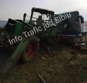 Potrivit IPJ Sibiu, șoferul unui autocar, în vârstă de 46 de ani, din Sibiu, în timp ce conducea spre Alba, nu a păstrat distanța regulamentară în trafic și a intrat în coliziune cu un tractor, condus de un bărbat în vârstă de 61 de ani, din Gârbova, angajat în efectuarea neregulamentară a virajului la stânga.