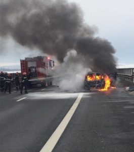 Un autoturism Dacia Logan a fost distrus în totalitate, după ce a luat foc în mers pe Autostrada A1 Sebeș – Sibiu