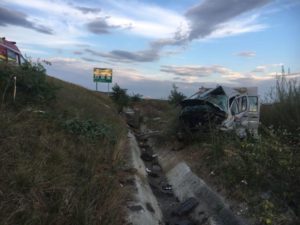 ”În jurul orei 19,00, pe Autostrada A1, km. 261+700, calea 2, zona localitatea Cristian, din cauza exploziei pneului stânga față al autovehiculului tragător, șoferul unui ansamblu rutier, microbuz+remorca, pierde controlul direcției de mers și se rastoarnă în afara parții carosabile. Șofer de 69 de ani, județul Mures, singur țn auto, transportat la spital conștient. Fară probleme de trafic”, potrivit IPJ Sibiu.