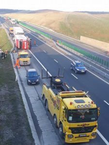 Autocamionul ocupă banda de urgenţă şi jumătate din prima bandă, autovehiculele fiind direcţionate pe banda a doua.