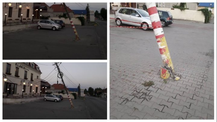 Un stâlp de electricitate rupt pune în pericol viața trecătorilor din Sebeș