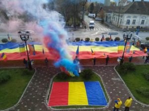 Un steag tricolor de zeci de metri a fost desfășurat și fluturat în centrul municipiului Sebeș, în timp ce era lansat fum în culorile naționale