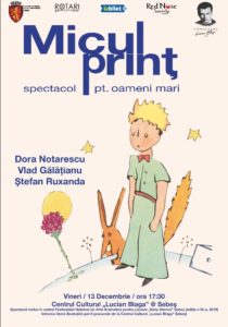 Vineri, 13 decembrie 2019, începând cu ora 17:30, sala de spectacole a Centrului Cultural „Lucian Blaga” Sebeș va găzdui reprezentația de teatru „Micul prinț-spectacol pentru oameni mari”, adaptat după un text de Antoine de Saint-Exupery.
